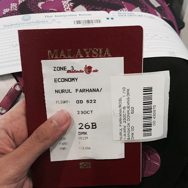 Maka bermulalah 3D2N oppss mungkin 2D2N di Bangkok sebab flight pukul 5:10 petang, naik Malindo Air. Dapat free baggage 20kg setiap sorang tapi bawa luggage kecik je kurang 10kg. Because too lazy to seret-seret bagasi.