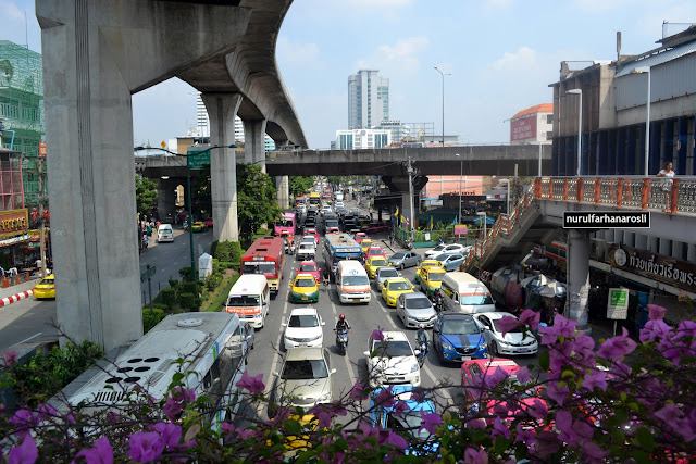 Sudah sampai dekat stesen bas Victory Monument semua akan turun dan naik jejantas dekat tepi untuk melintas pergi stesen BTS. Jadi tengah2 bulatan tu takde apa dekat atas dia apatah lagi landasan MRT dia ada lengkungan separa bulatan. Bertawaf la separuh bulatan daripada stesen bas ke stesen MRT dia.