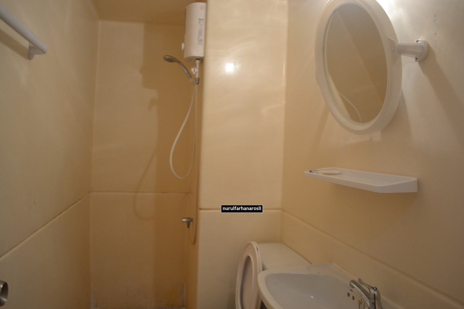 Pintu dia boleh buka dua, kecil je dan rendah sebab siling rumah ni rendah. Ada grill sekali manga untuk keselamatan. Masuk rumah je toilet dia dekat sebelah kanan. Shower, toilet, air paip, sinki, cermin, sabun, tempat letak tuala, tong sampah dalam toilet. Hahahahahaha yang kelakarnya, toilet dengan siki dia rendah. Masa nak cuci muka dekat sinki kepala terlanggar-langgar dekat rak bawah cermin tu.