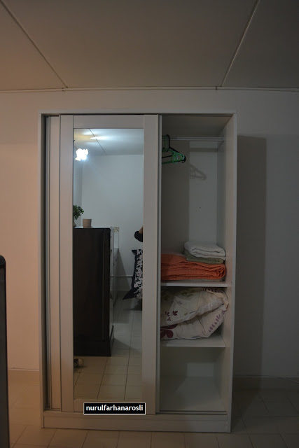 Keluar bilik air ada almari dua pintu siap cermin, dalam tu ada dua helai tuala, hanger, extra selimut dan extra dua bantal. Perfect tapi sepanjang kat situ tak terpikir pula nak guna tuala tu sebab ada bawa tuala sendiri dan satu tuala yang diberi buat jadi lap kaki lepas keluar dari bilik air. Bagasi dengan bag boleh la simpan dalam almari.